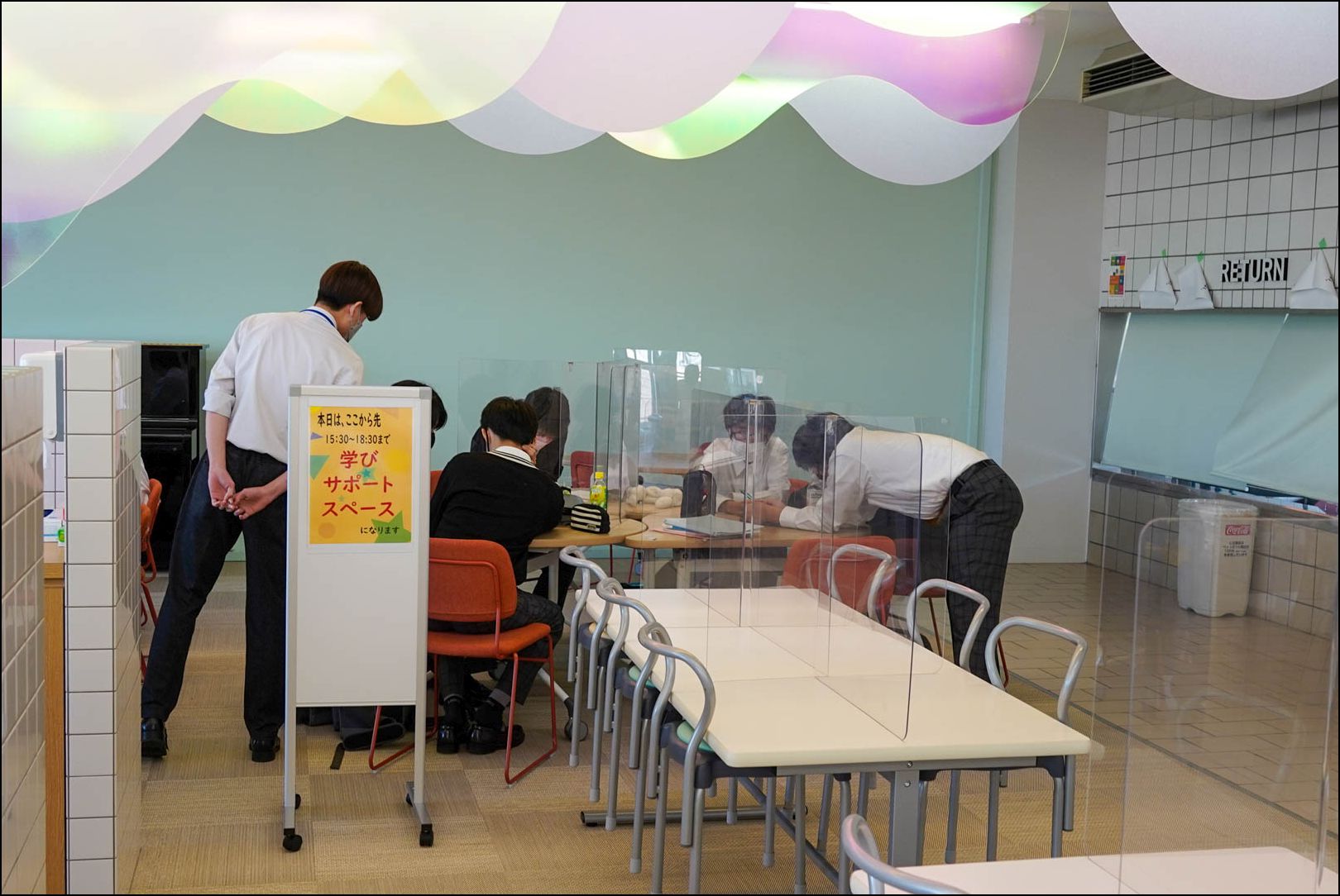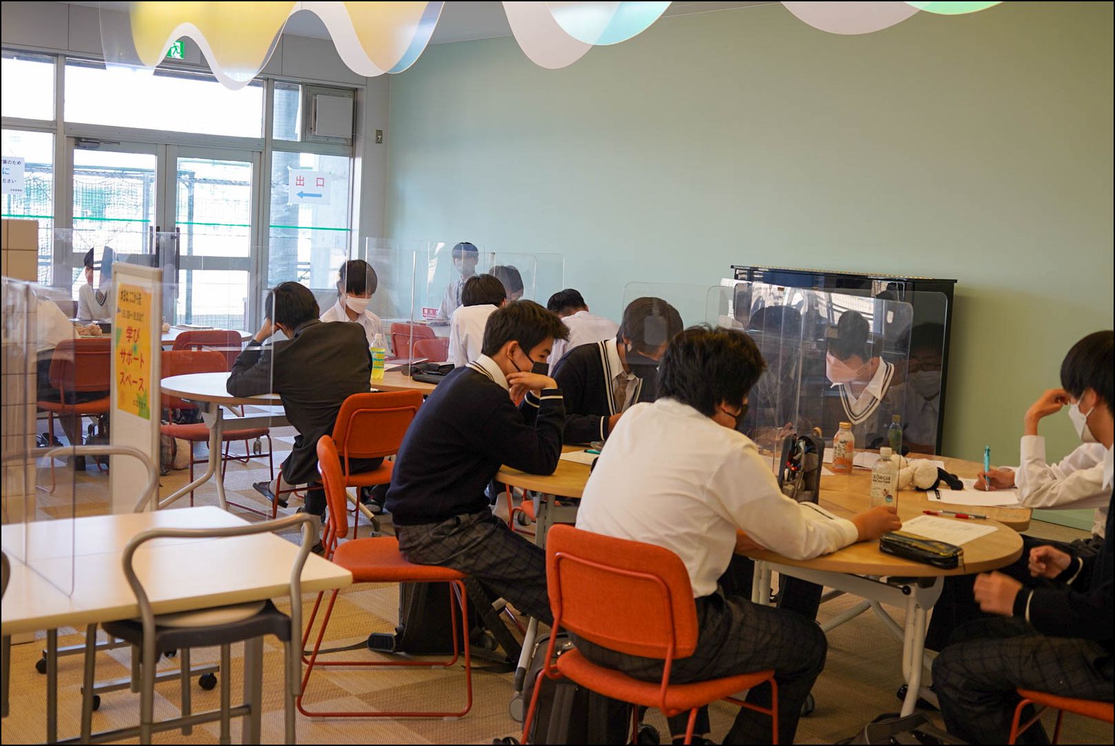 改装し、快適になった食堂の一画を活用し、「まなびサポートスペース」を5月末から開設しました。週4日、午後3時30分から6時30分の3時間、チューターを配置し、生徒の質問、相談等に対応しています。まだまだ、生徒の利用は多くない状況ですが、積極的に活用するように促していきます。チューター配置に係る費用等については、保護者会の支援をいただいています。