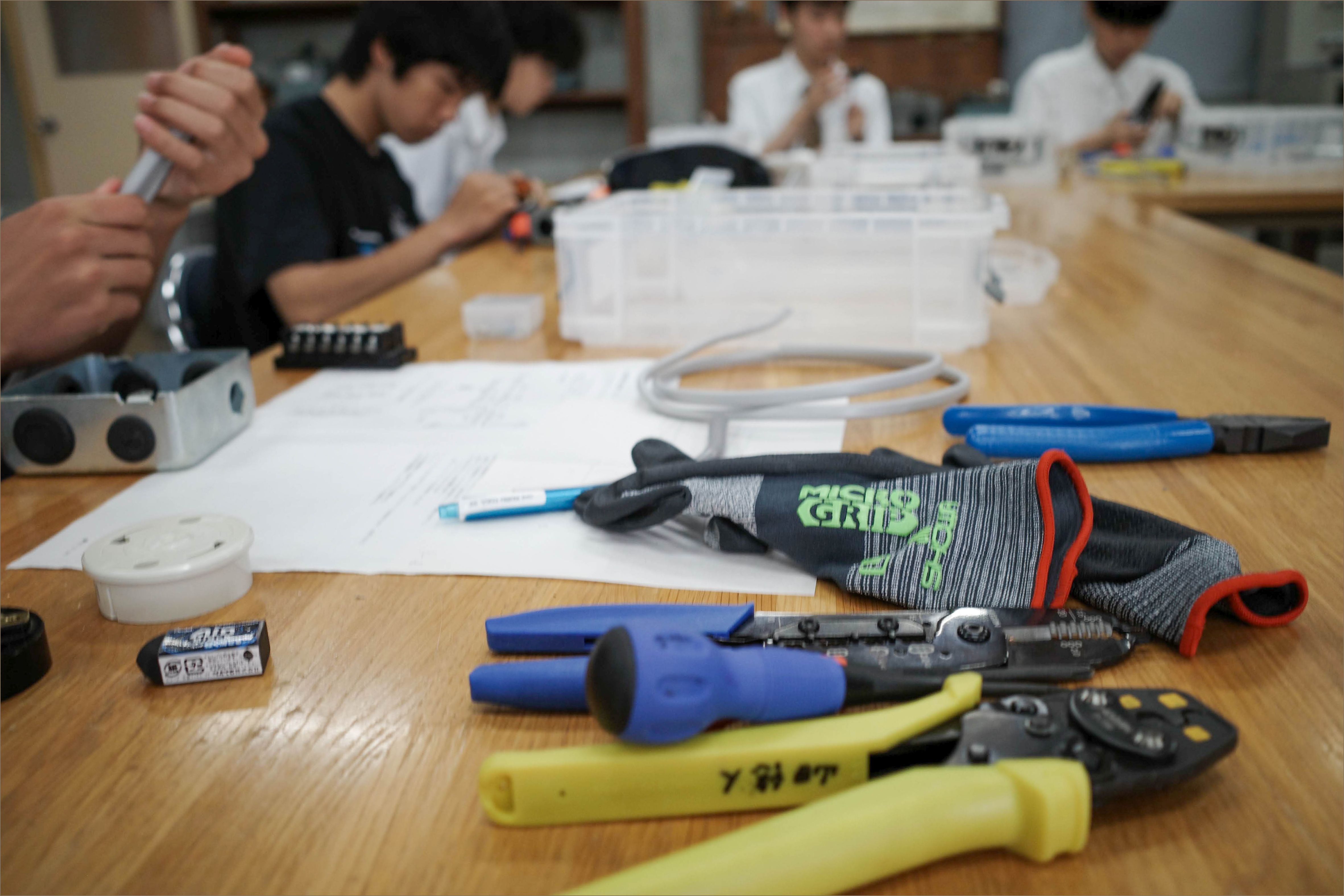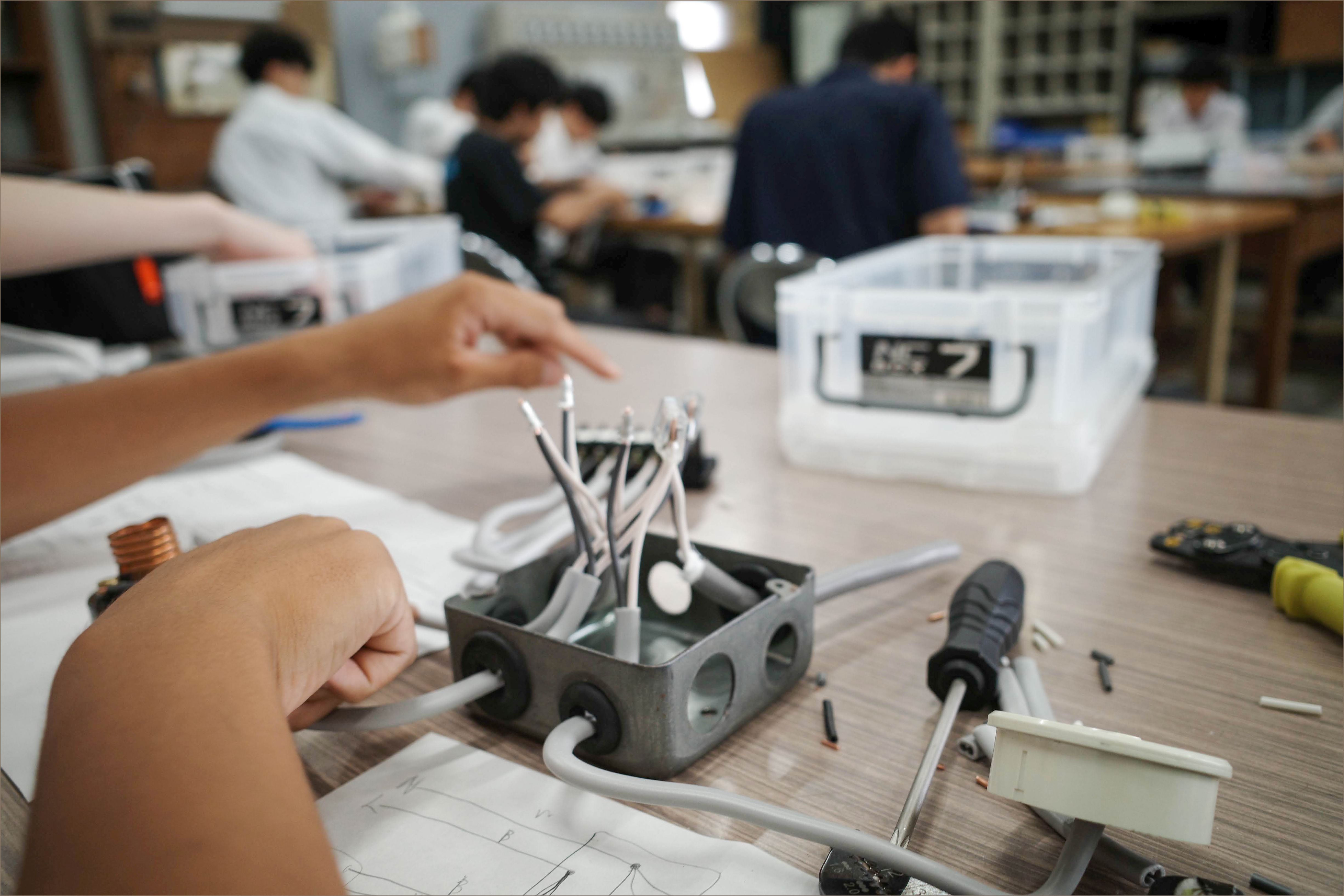 第二種電気工事の令和5年度上期の筆記試験に合格した生徒が、7/22、23に行われる技能試験に向けた講習に取り組んでいます。