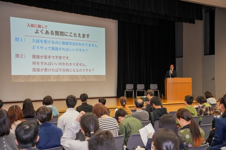 多数の中学生、保護者が来場され、熱心に聞いていただきました。ありがとうございました。