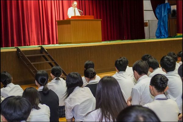 保護者宛の文書を持ち帰ってもらいますが、8月26日の2学期始業式が終わった後、続けてこの場で、講演会を行います。皆さんの中には行ったことがある人がいるかもしれませんね。お好み焼きの「千房」の中井会長に来ていただき、「人間の底力~人間って欠けているから伸びるんや」というテーマでお話をしていただきます。2学期の始まりに皆さんを励まし、モチベーションを上げてくださると思います。予定しておいてください。