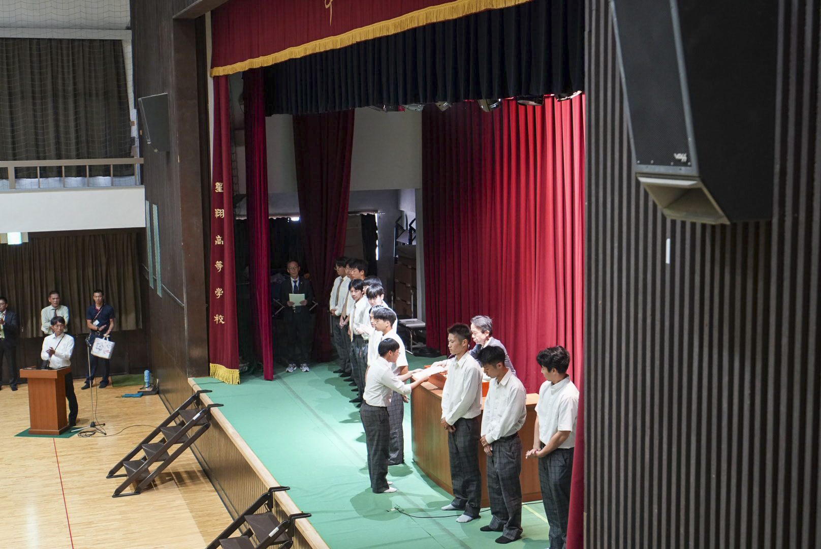 講話の後、資格取得(ジュニアマイスター、星翔マイスター)で成果をあげた生徒に壇上に上がってもらい、紹介、顕彰しました。