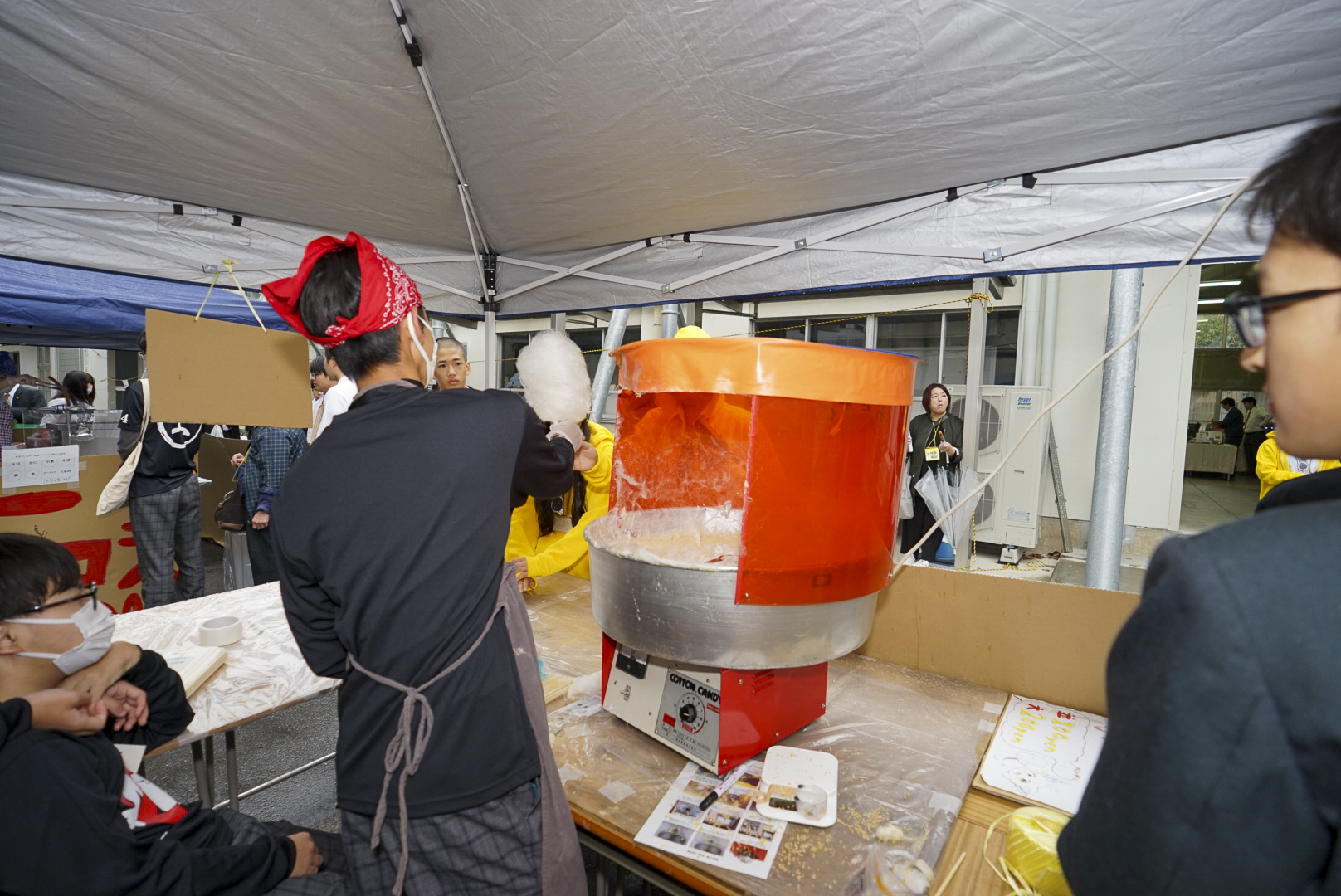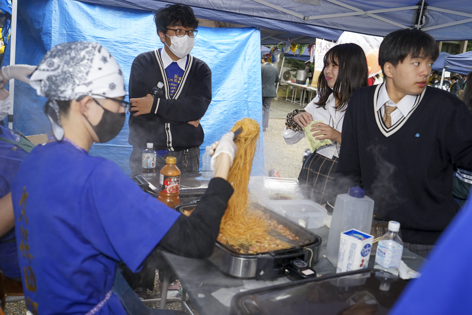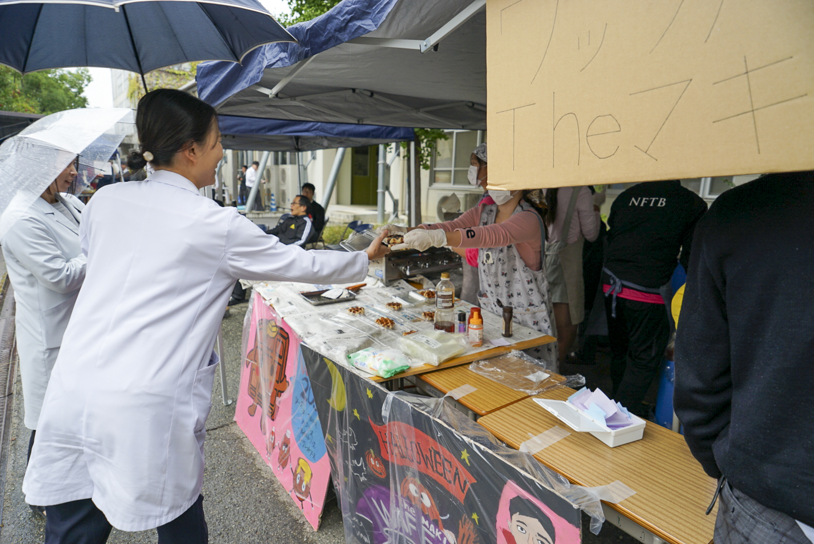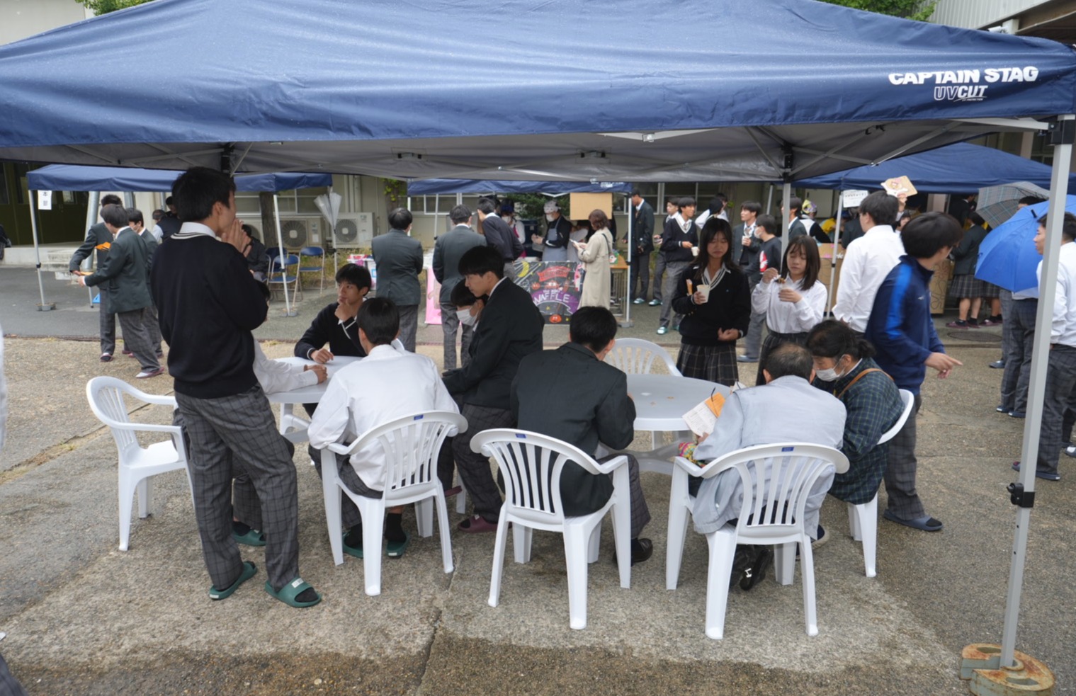 あいにく小雨が降る天候となりましたが、中庭での調理模擬店は大きな支障もなく運営され、多くの来場者で賑わいました。